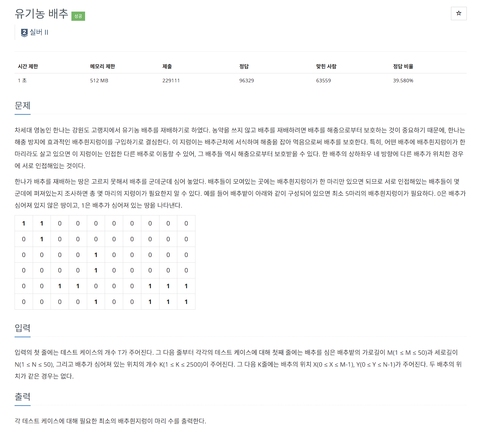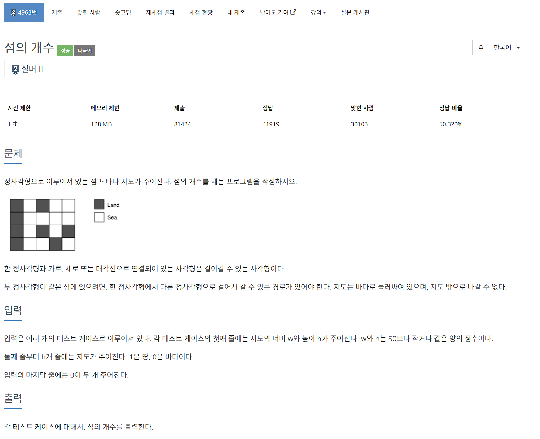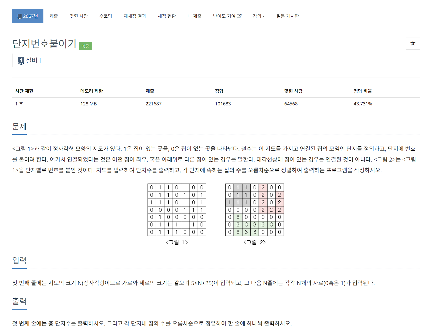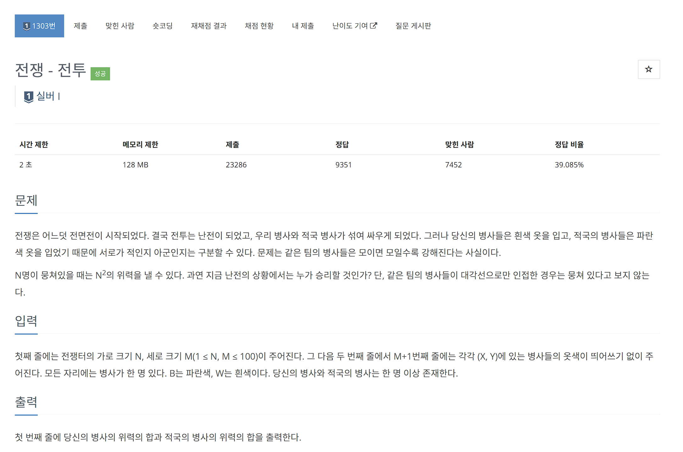 이번 문제는 전쟁 - 전투다문제 설명N × M 크기의 전쟁터가 있다각 칸에는 아군(W) 또는 적군(B)이 배치되어 있고,같은 진영이 상하좌우로 붙어 있으면 하나의 부대로 취급한부대 전투력 = (부대 인원 수)^2아군과 적군의 총 전투력을 각각 계산접근 방법1. 문제 구조 분석입력에서 N(가로, 열), M(세로, 행)이 주어진다전쟁터를 M행 × N열의 2차원 배열로 저장각 칸에서 DFS를 사용하여 같은 진영의 연결된 모든 칸 탐색.방문할 때마다 인원 수(count_parts)를 1씩 증가.탐색이 끝나면 (count_parts)^2를 해당 진영의 전투력에 더함.2. DFS 탐색상하좌우 이동을 위해 fourway_x와 fourway_y 방향 배열 사용.방문한 칸은 visited 배열에 체크.경계 체크 시 0 ..